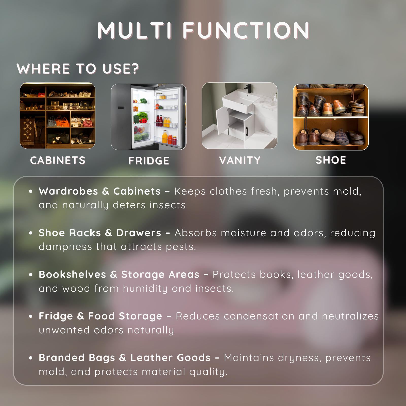 - High Moisture Absorption: Effectively reduces up to 70% of moisture in areas up to 0.5 cubic meters, maintaining a dry and comfortable environment.